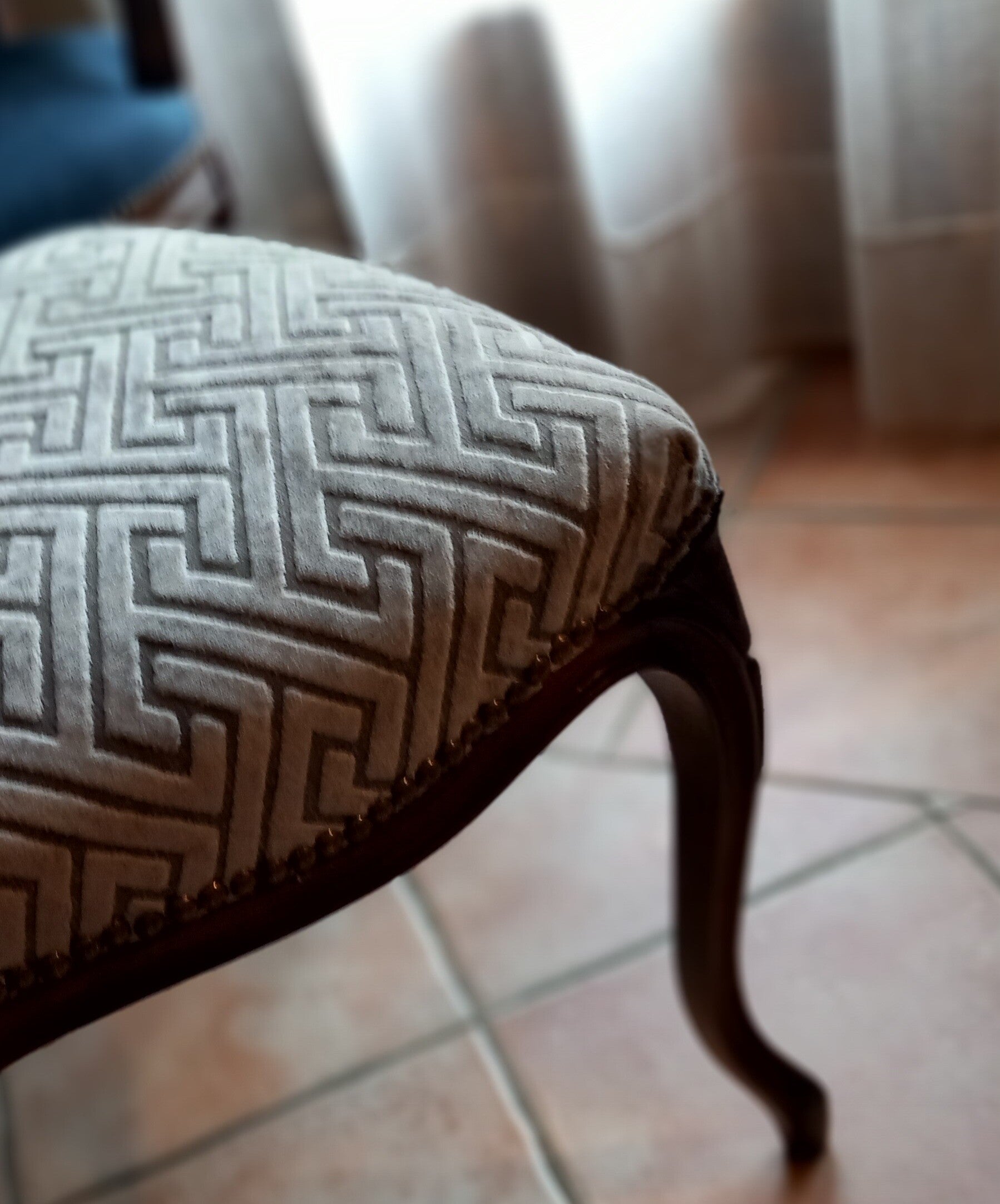 Tissu haute qualité tapissier velours texturé grège. Finition clous tapissier vieil or.