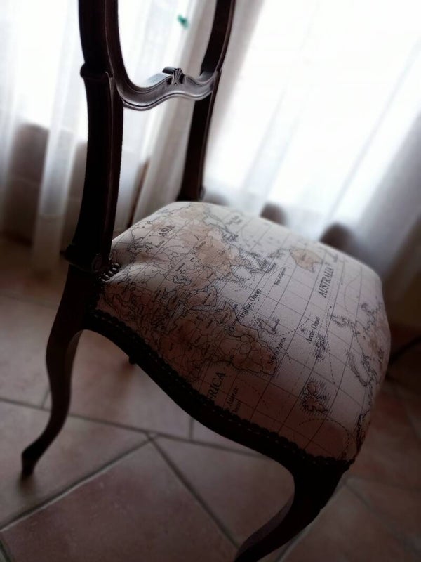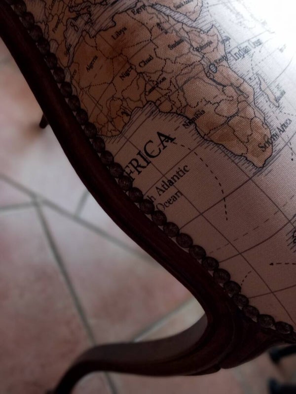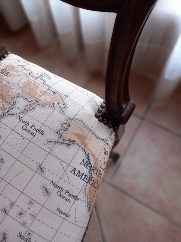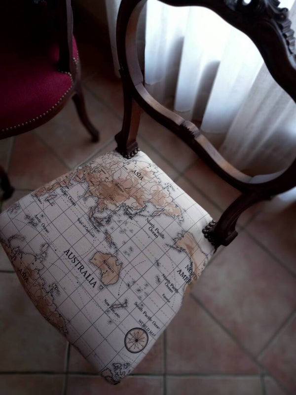 Tissu haute qualité toile coton Mappemonde vintage camaïeu de beiges et marron. Finition clous tapissiers vieil or.